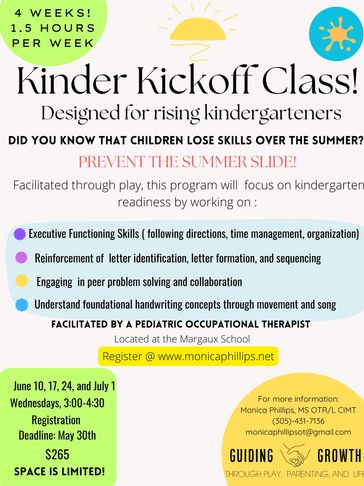 A summer class designed to build confidence and readiness for kindergarten! Led by a pediatric occupational therapist, this small-group class supports rising kindergarteners as they practice essential school skills in a playful, low-stress environment. Each session includes fine motor activities (like cutting, writing, and pencil grasp), early classroom routines (like following directions, organization skills, and group transitions), and regulation strategies to support attention, peer problem solving and independence. Perfect for kids who would benefit from a gentle boost before the big first day!